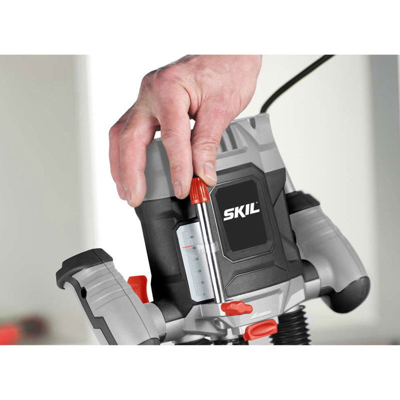 Freza SKIL 1841 este unealta ideala pentru executarea canelurilor si falturilor, pentru fasonare, tesire si realizarea profilurilor si aschierilor decorative. Dispune de un motor puternic de 1200 W, care abordeaza cu usurinta toate lucrarile de aschiere la adancimi de pana la 55 mm. Masina SKIL 1841 se preteaza la o gama larga de materiale, multumita vitezei preselectabile si reglajului fin al adancimii. Puteti adapta in mod convenabil turatia si adancimea la sarcina de executat. Functia de blocare a axului permite schimbarea rapida si simpla a bitului. Freza pentru lemn este livrata impreuna cu un bit drept, trei patroane, un ghidaj paralel, un stift de centrare si un inel de copiere.