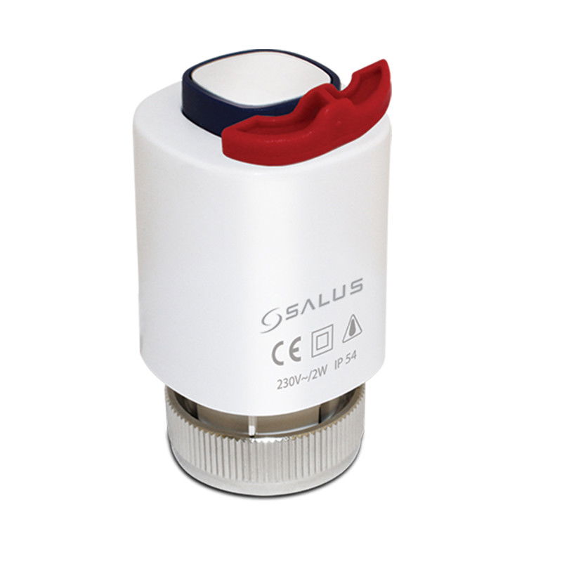 Actuator pentru distribuitoare, utilizat in sistemele de incalzire. Inainte de a fi instalat, actuatorul este in pozitia normal deschis, iar dupa ce se monteaza se scoate piedica, el devenind normal inchis.