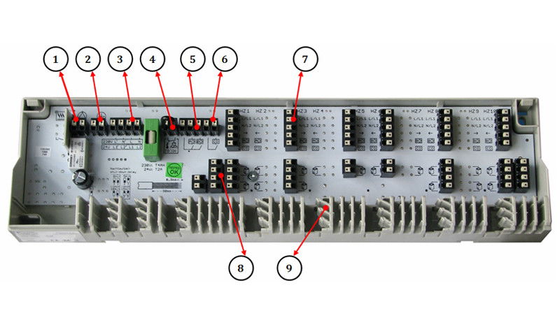 - Conexiuni pentru capete termoelectrice (actuatoare) - Tensiune de alimentare pentru actuatoarele conectate.