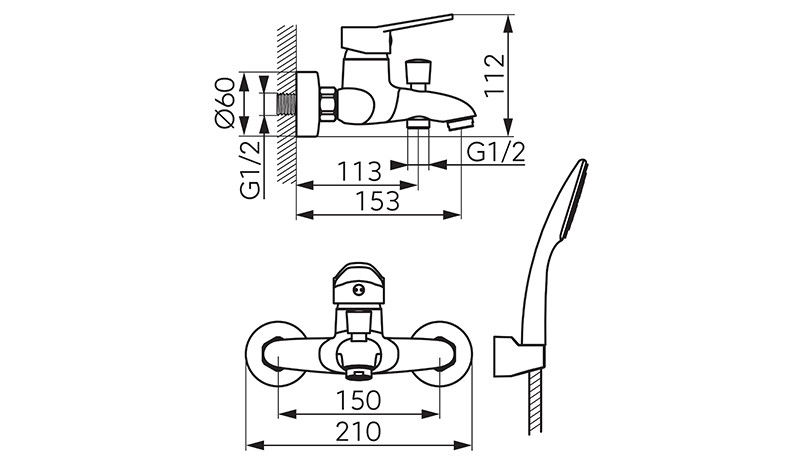 Baterie cada-dus cu montaj pe perete + set de dus inclus