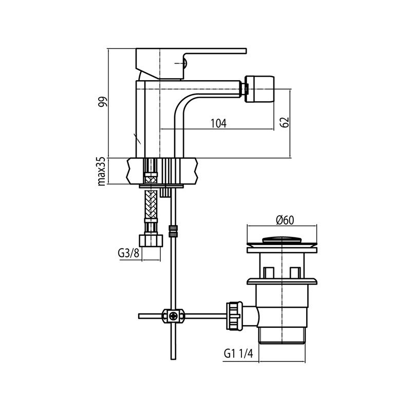 Baterie bideu stativa cu ventil pop-up crom.