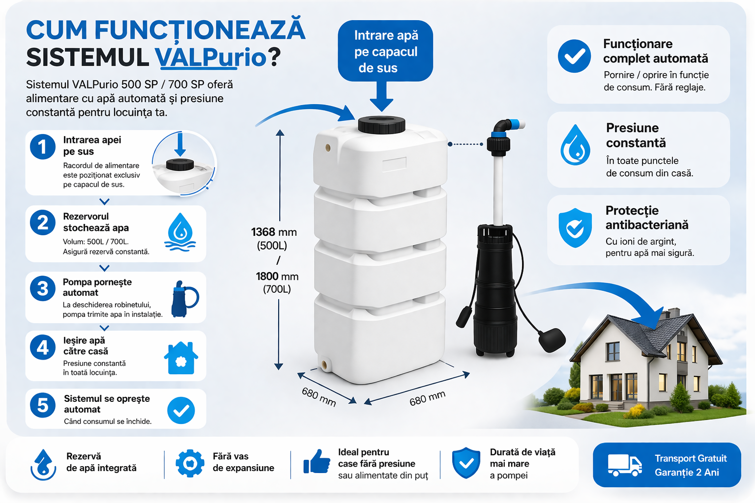 Un sistem VALPurio 500 SP sau 700 SP este o soluție completă pentru alimentarea cu apă a locuinței, care include rezervor și pompă automată, oferind presiune constantă și rezervă de apă.