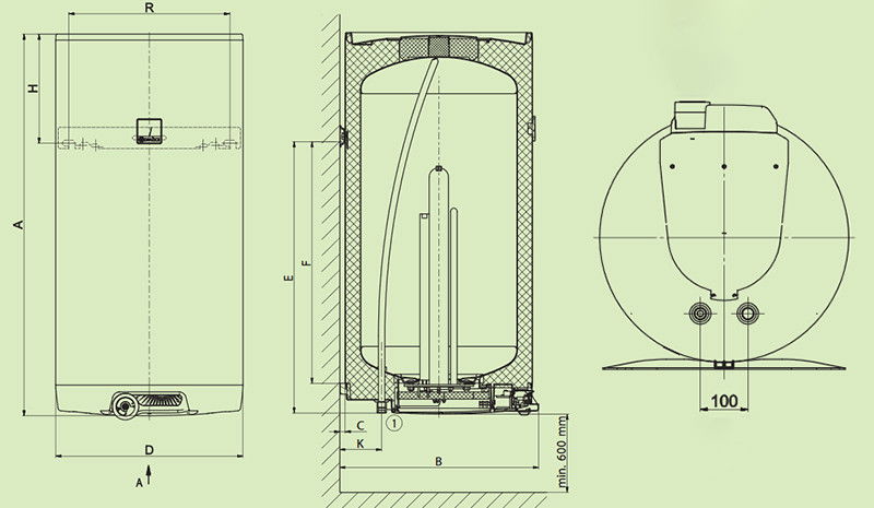 In partea superioara este amplasat termometrul, care indica temperatura apei din boiler. Corpul boilerului este izolat cu un strat de poliuretan, care garanteaza pierderi minime pentru caldura. Instalatia electrica este amplasata in partea inferioara a incalzitorului, sub o carcasa de protectie.