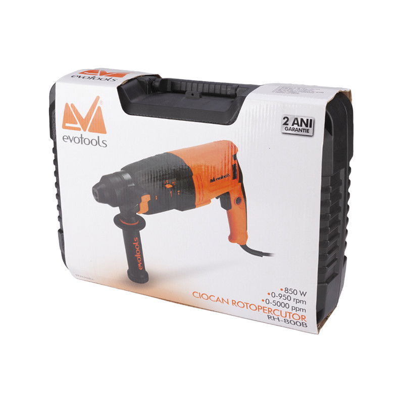Ciocanul Rotopercutor RH 800B EvoTools este unealta ideala pentru toate lucrarile de gaurire, gaurire cu percutie si daltuire, fiind dotat cu un motor puternic de 850W si o energie de impact de 3.2 J ce asigura un mod de lucru fara efort.