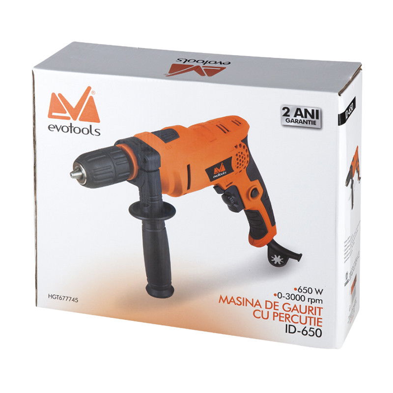 Masina de gaurit cu percutie ID 650 este prevazuta cu un motor de 650 W ce asigura o turatie variabila de pana la 3000 rotatii pe minut.