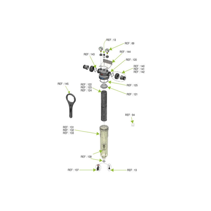 Filtrul vine echipat cu manson standard de 25 de microni, fiind posibila inlocuirea sa cu mansoane de la 1 micron pana la 300 de microni. Mansoanele de 150 si 300 de microni sunt concepute pentru a fi curatate si refolosite.