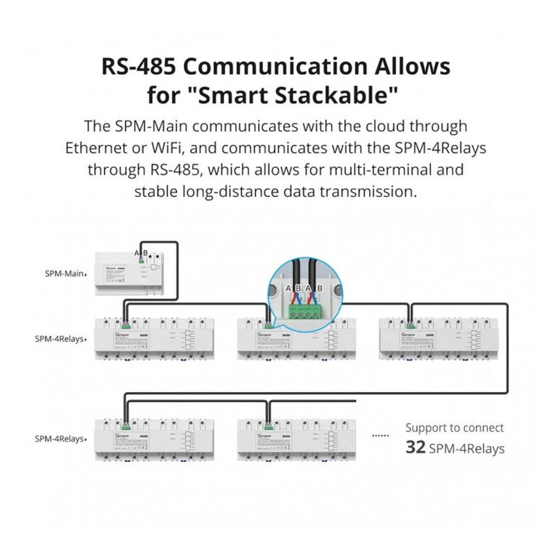Unui Sonoff SPM Main i se pot conecta 32 relee Sonoff SPM-4Relay (4 canale fiecare, cu control independent).