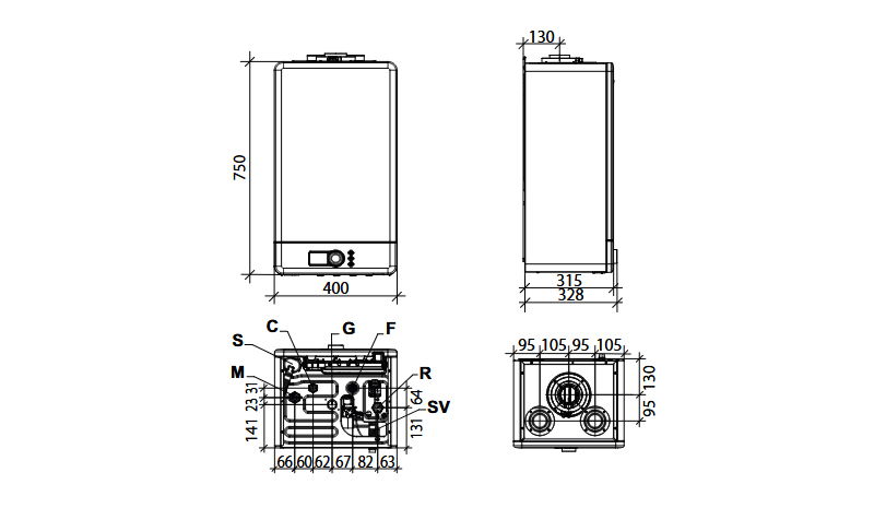 - R: Retur instalatie de incalzire 3/4"