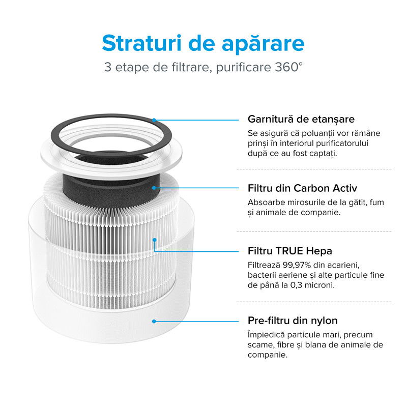 Purificatorul de aer CoreP350 True HEPA reduce pana la 99,97% din germenii nocivi, parul de la animalele de companie, praful, fumul, polenul si alti alergeni de pana la 0,3 microni. Imbunatateste calitatea aerului si trateaza alergiile usurand stranutul, tusea, sinusurile si respiratia grea.