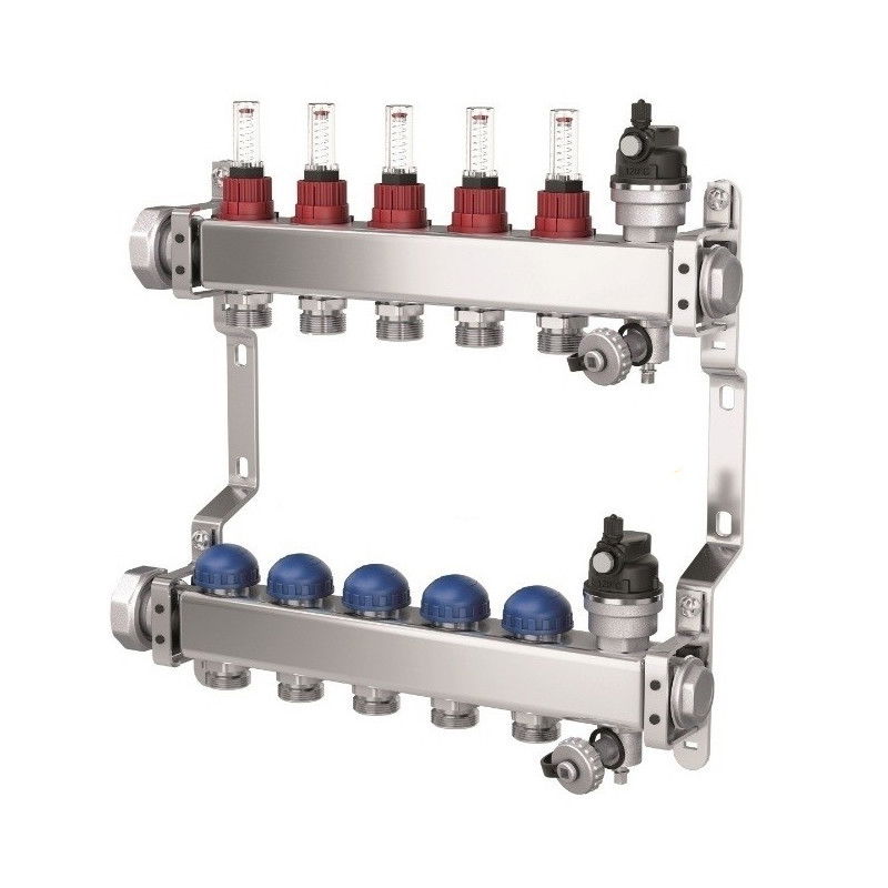 Acest distribuitor este fabricat din otel inoxidabil cu profil 40x40 mm. Pe tur, distribuitorul este echipat cu indicatori de debit cu functie de blocare si memorie presetata si posibilitatea de curatare a flaconului murdar. Pe retur, distribuitorul are valve termostatice integrate pentru instalarea servomotoarelor cu conexiune M30x1,5. Ambele bare colectoare sunt extinse cu cate o sectiune in care exista un aerisitor automat si supapa de evacare. Produsul este preasamblat si pregatit pentru montaj. Setul include si etichete din plastic pentru descrierea fiecarei sectiuni, dibluri de fixare si manual de utilizare.
