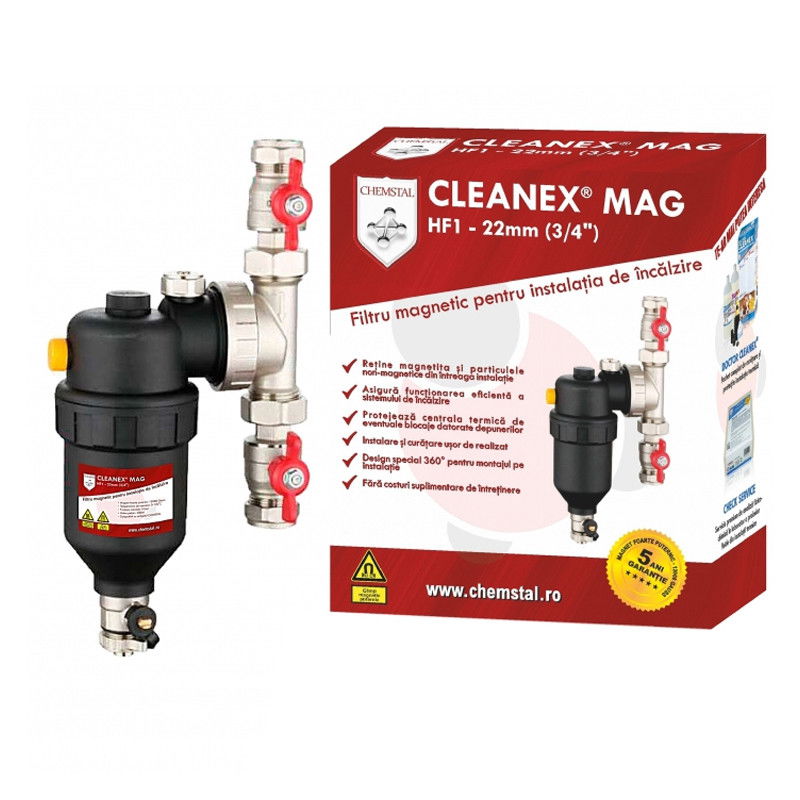 Filtrul antimagnetita CLEANEX® MAG HF1 3/4" (22MM) reprezinta solutia ideala de protectie impotriva efectelor daunatoare ale magnetitei si a celorlalte impuritati existente in sistemele termice echipate cu calorifere din otel sau fonta. Echipamentul poate fi instalat cu usurinta in orice pozitie pe returul instalatiei de incalzire, prin intermediul adaptorului 360° si a robinetilor de izolare 3/4" inclusi.