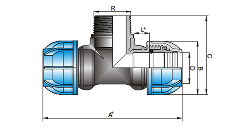B Mufa de strangere: Polipropilena aditivata cu colorant, cu stabilitate ridicata la radiatia UV si rezistenta la caldura (grad 8 conf. normei DIN 54004). Culoare RAL 5005.
