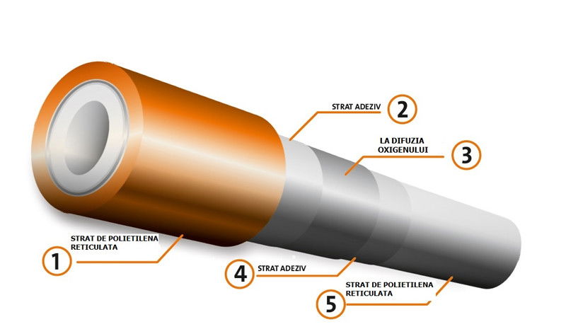 - protectia completa a barierei la difuzia oxigenului cu un strat PE-X interior si exterior (cu coeficienti de dilatare si de conductivitate termica identici)