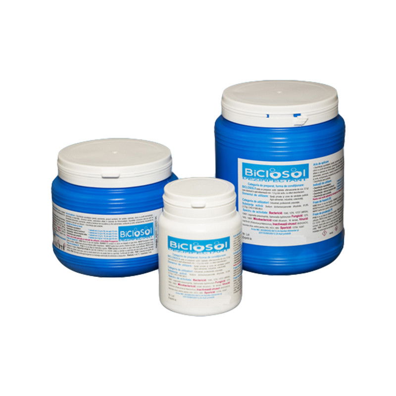 O tableta de BICLOSOL de 3,3g elibereaza prin dizolvarea in apa 1,5g clor activ.