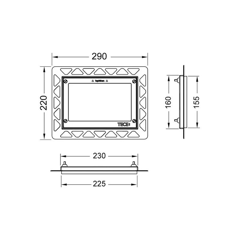 Kit de instalare pentru montaj incastrat al clapetelor de actionare pentru TECEloop din sticla, TECEloop plastic, TECEvelvet, TECEsquare din sticla, TECElux Mini si TECEnow. Rama de montaj ajustabila in adancime pentru acoperiri ale peretelui de la 5 la 18 mm (de la 18 la 33 mm cu bolt de ajustare – cod produs 9820181). Include cheia pentru demontat clapeta de actionare.
