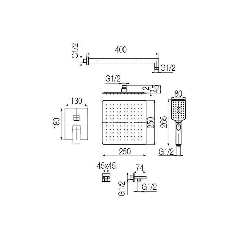 Set de dus incastrat format din trei componente: dus cu furtun, para cu efect de ploaie si suport dus.
