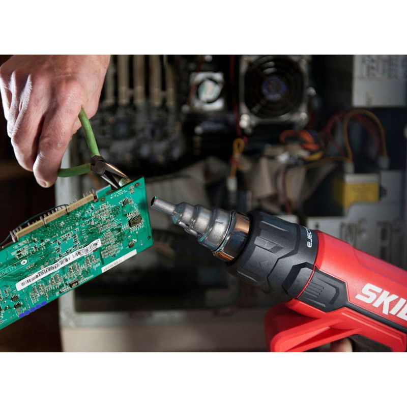 Suflanta cu aer cald este compatibila cu cele mai des utilizate si mai raspandite duze de pe piata, astfel incat puteti gasi intotdeauna duza potrivita pentru aplicatia dumneavoastra. Datorita afisajului LCD util puteti seta cu precizie temperatura corecta si setarile fluxului de aer pentru aplicatia dumneavoastra. Puteti selecta temperaturi cuprinse intre 50 si 650 °C si puteti alege intre cinci setari ale fluxului de aer cuprinse intre 250 si 500 l/min. Functia unica de ejectare a duzei permite demontarea imediata si sigura a duzelor, in special atunci cand acestea sunt fierbinti, pentru a le schimba rapid in vederea utilizarii lor pentru diferite aplicatii. SKIL 8040 GA este livrat intr-o geanta de transport cu o duza de reductie, o duza reflectoare, o duza de reductie de 9 mm si o duza plata.