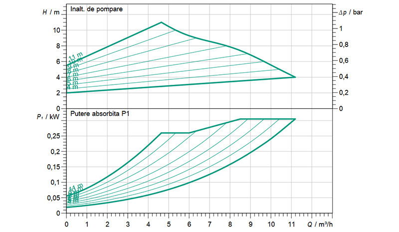 • Moduri de reglare preselectabile pentru optimizarea sarcinii Δp-c (presiune diferentiala constanta), Δp-v (presiune diferentiala variabila)