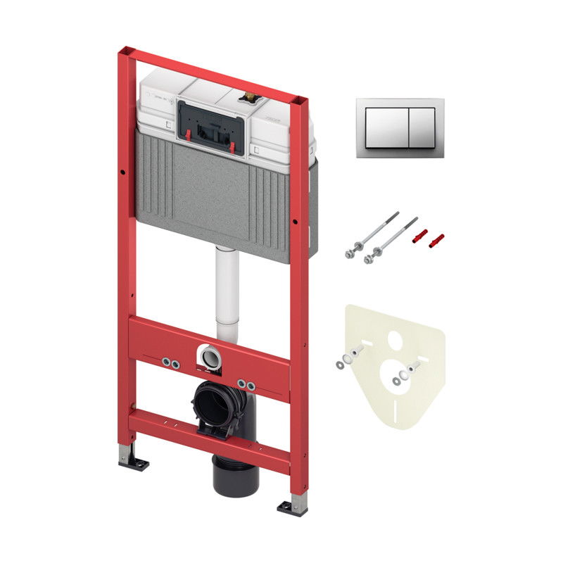 Modulul de WC TECEbase cu rezervor Base are inclusiv in pachet clapeta de actionare cromata lucioasa pentru sistem cu actionare dubla, set de izolatie fonica si montaj pe perete, inaltime de instalare 1120 mm. Modul de WC pentru montaj monobloc, in fata unui perete solid sau pentru integrarea in pereti cu structuri portante de metal sau lemn.