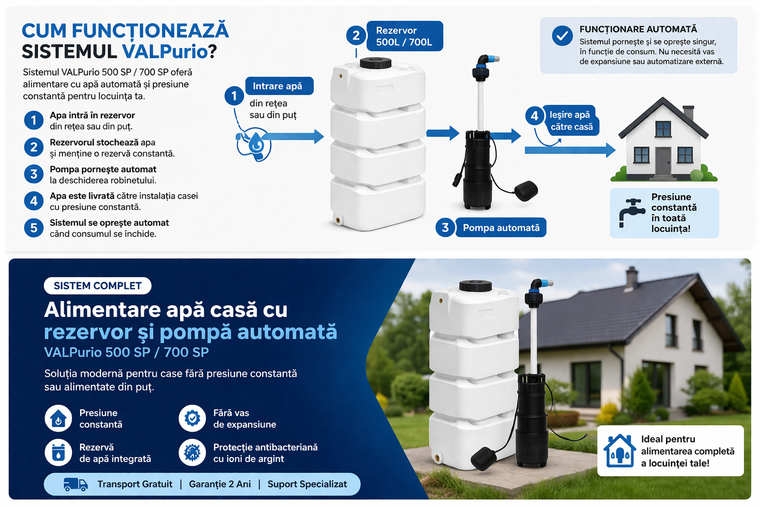 Este un sistem complet pentru alimentarea cu apă a locuinței, care include rezervor de aproximativ 500 litri și pompă automată, asigurând presiune constantă și rezervă de apă.