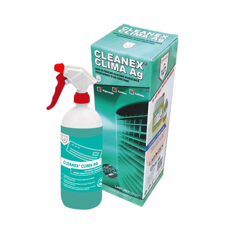 Cleanex Clima Argint este un detergent dezinfectant, cu ioni de argint destinat uzului profesional pentru curatarea aparatelor de aer conditionat, ventiloconvectoare si chillere.