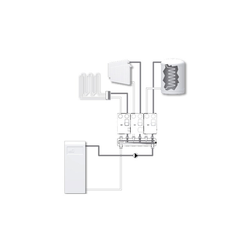 Seria GMA400 este un distribuitor-colector pentru conectarea a doua pana la cinci grupuri de circulatie si este destinat in special sistemelor unde nu exista pompa de circulatie pe circuitul primar; acesta se poate folosi si pentru sistemele cu pompa de circulatie pe primar (cu cazan mural de exemplu) avand un bypass integrat pentru situatia in care niciun grup de circulatie nu functioneaza.