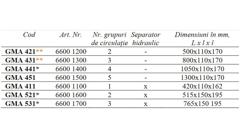 Seria GMA de distribuitoare este destinata pentru a asigura conectarea facila a doua, trei, patru sau cinci grupuri de circulatie din seriile GDA, GFA, GRA sau GRC in paralel. GMA sunt echipate cu izolatie termica din polistiren conform normativelor si sunt livrate cu coliere de montaj si sunt prevazute cu un locas special pentru montarea unui senzor.
