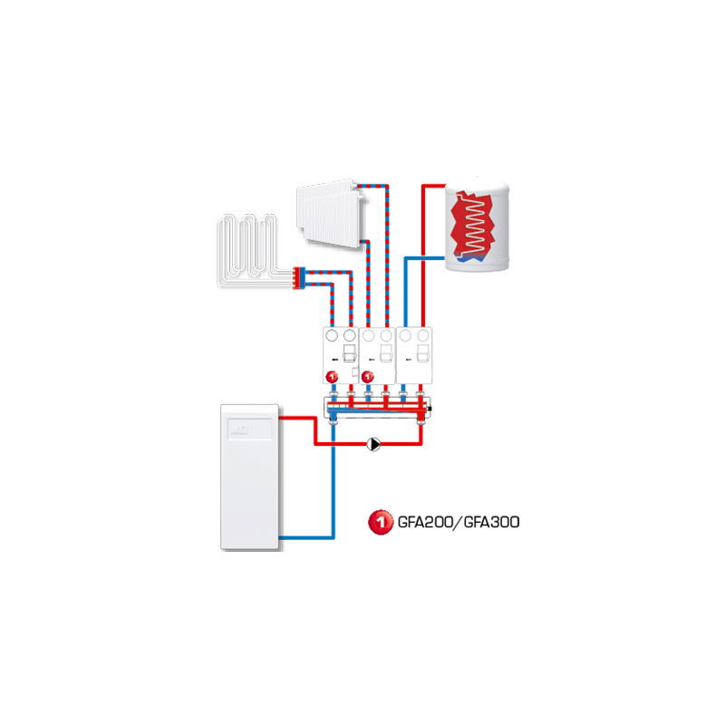 GFA este un grup de circulatie compact destinat sa asigure in cel mai eficient mod posibil distributia agentului pe circuitul tur la o temperatura fixa - in special pentru sistemele de incalzire prin pardoseala. Este echipat cu un ventil termostatic de amestec VTA572, pompa de inalta eficienta energetica si cu o termoizolatie croita special pentru a minimiza pierderile de energie. Toate componentele necesare sunt incluse, produsul a fost creat sa asigure o instalare foarte simpla si o precizie de reglare foarte buna.