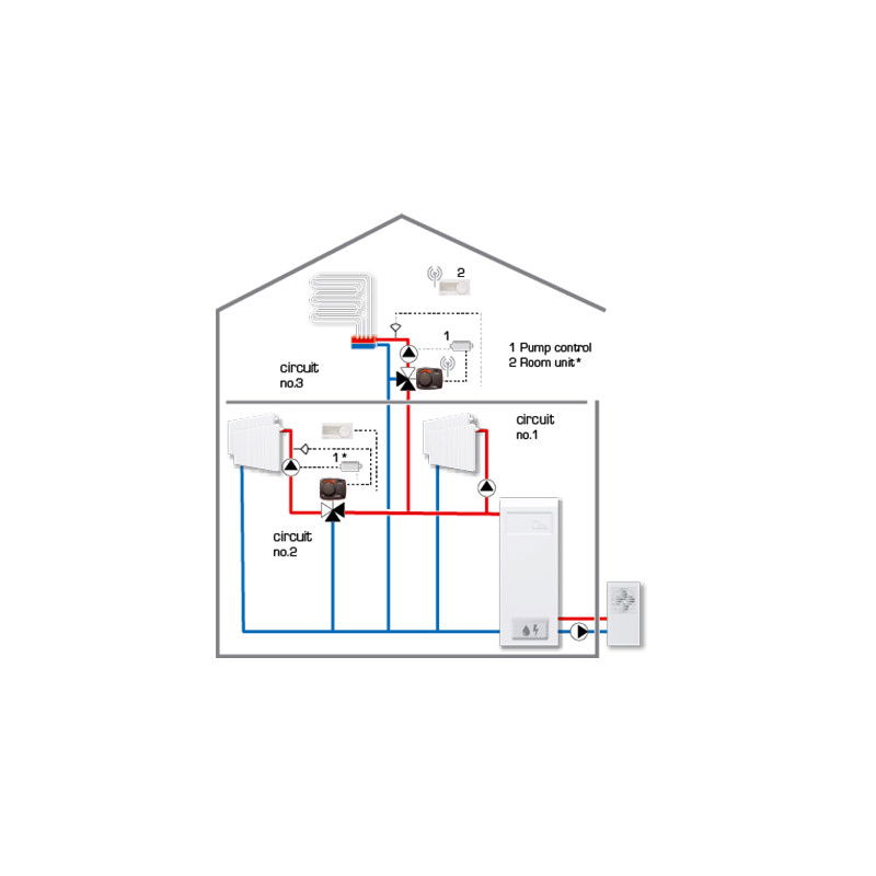 - controlul de zona sau pe un etaj al temperaturii ambiante in instalatiile cu incalzire cu radiatoare sau prin pardoseala, avand dubla functionare: asigura atingerea temperaturii ambiante si realizeaza limitarea temperaturii in circuitul tur la o valoare sigura pentru pardoseala (limitele minime si maxime din conducta circutiului tur/distribuitor ajustabile)
