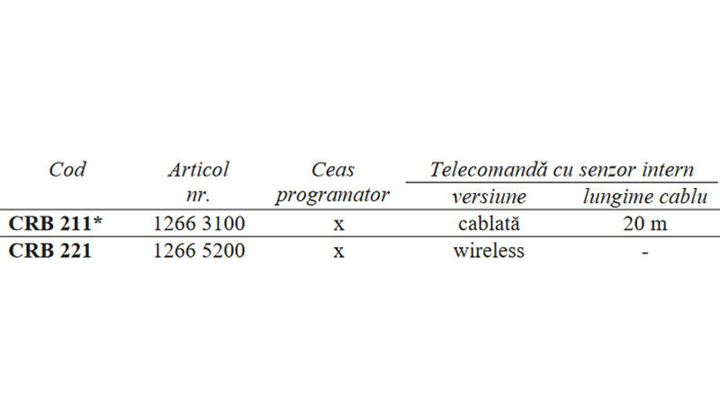- telecomanda cu senzor de ambianta integrat, executata intr-un design modern, dotata cu rozeta de reglaj pentru setarea parametrilor si afisaj iluminat, cu ceas programator.