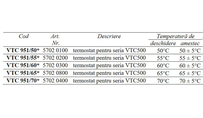 Termostate cu diferite valori ale temperaturii de deschidere, compatibile cu toate modelele de LTC161, LTC171, LTC261, LTC271, LTC361, LTC381, VTC511, VTC512 și VTC531.