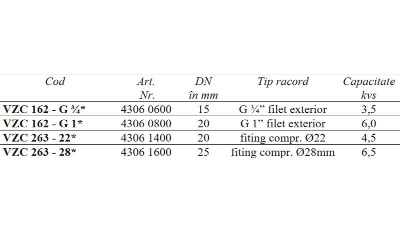 Seria VZC de ventile (vane) de comutatie/derivatie este destinata a fi utilizata in aplicatii ca: pompe de caldura, incalzire prin pardoseala, control de zona, ventilo-convectoare sisteme solare. Ventilele VZC sunt fabricate din alama DZR si sunt capabile sa schimbe rapid directia de curgere intre cele doua circuite. Portul permanent deschis este AB (in partea inferioara), sub actiunea servomotorului, ventilul comuta de pe portul A pe portul B si invers. Dotat cu microprocesor cu functie anti-gripare ce actioneaza automat motorul dupa fiecare saptamâna intreaga de stationare. Doar pentru circuite inchise.