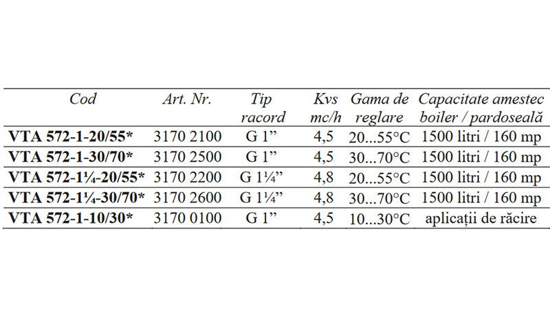 Ventilele termostatice de amestec VTA sunt destinate pentru prepararea directa a apei calde menajere in sistemele cu sau fara pompa de recirculare, sisteme mici de incalzire prin pardoseala sau sisteme de incalzire cu sursa dubla de energie: cazan si panouri solare, cu functie anti-oparire. Ventilele asigura o precizie foarte buna de reglare pe portul de amestec indiferent de variatiile de temperatura sau presiune dintre portul de apa rece si calda. Montare facila in instalatie datorita portului de amestec in linie cat si a multiplelor optiuni de conectare.