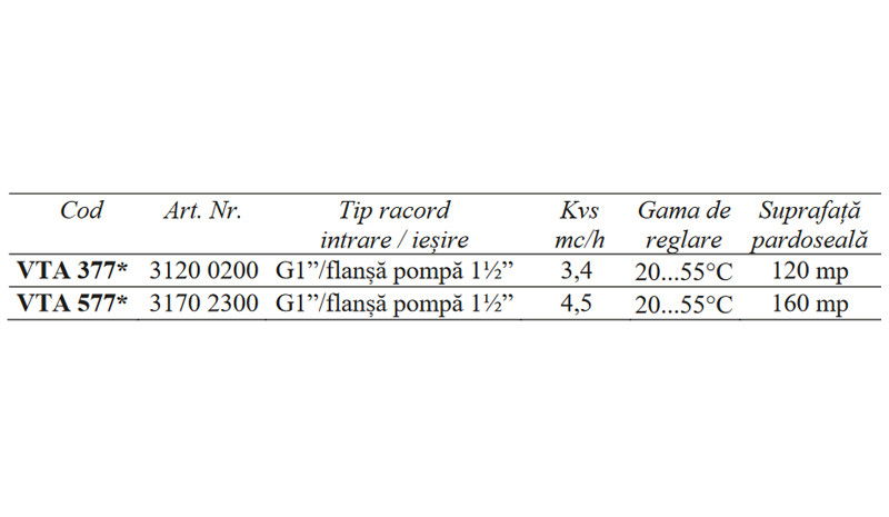 Ventilele termostatice de amestec VTA sunt destinate pentru prepararea directa a apei calde menajere in sistemele cu sau fara pompa de recirculare, sisteme mici de incalzire prin pardoseala sau sisteme de incalzire cu sursa dubla de energie: cazan si panouri solare, cu functie anti-oparire. Ventilele asigura o precizie foarte buna de reglare pe portul de amestec indiferent de variatiile de temperatura sau presiune dintre portul de apa rece si calda. Montare facila in instalatie datorita portului de amestec in linie cat si a multiplelor optiuni de conectare.