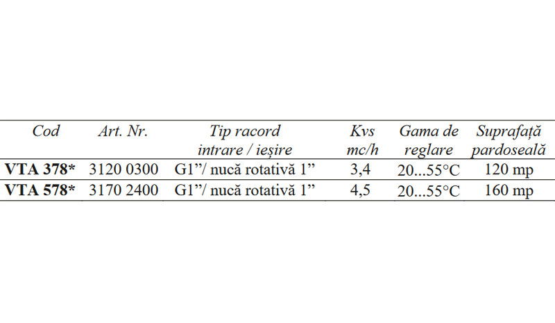 Ventilele termostatice de amestec VTA sunt destinate pentru prepararea directa a apei calde menajere in sistemele cu sau fara pompa de recirculare, sisteme mici de incalzire prin pardoseala sau sisteme de incalzire cu sursa dubla de energie: cazan si panouri solare, cu functie anti-oparire. Ventilele asigura o precizie foarte buna de reglare pe portul de amestec indiferent de variatiile de temperatura sau presiune dintre portul de apa rece si calda. Montare facila in instalatie datorita portului de amestec in linie cat si a multiplelor optiuni de conectare.