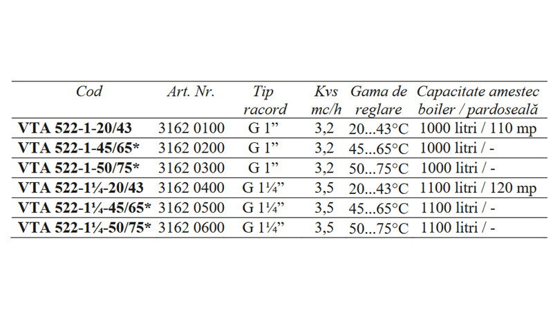 Ventilele termostatice de amestec VTA sunt destinate pentru prepararea directa a apei calde menajere in sistemele cu sau fara pompa de recirculare, sisteme mici de incalzire prin pardoseala sau sisteme de incalzire cu sursa dubla de energie: cazan si panouri solare, cu functie anti-oparire. Ventilele asigura o precizie foarte buna de reglare pe portul de amestec indiferent de variatiile de temperatura sau presiune dintre portul de apa rece si calda. Montare facila in instalatie datorita portului de amestec in linie cat si a multiplelor optiuni de conectare.