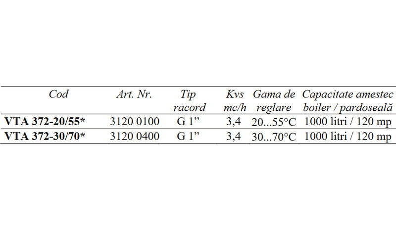 Ventilele termostatice de amestec VTA sunt destinate pentru prepararea directa a apei calde menajere in sistemele cu sau fara pompa de recirculare, sisteme mici de incalzire prin pardoseala sau sisteme de incalzire cu sursa dubla de energie: cazan si panouri solare, cu functie anti-oparire. Ventilele asigura o precizie foarte buna de reglare pe portul de amestec indiferent de variatiile de temperatura sau presiune dintre portul de apa rece si calda. Montare facila in instalatie datorita portului de amestec in linie cat si a multiplelor optiuni de conectare.