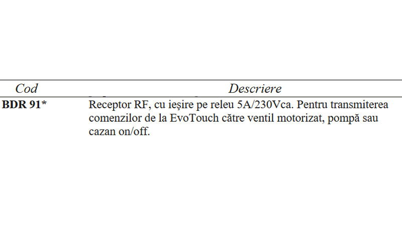 Receptor RF, cu iesire pe releu 5A/230Vca. Pentru transmiterea comenzilor de la EvoTouch catre echipamentele controlate: robinete motorizate de zona, pompa sau cazan on/off.