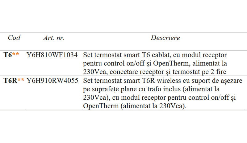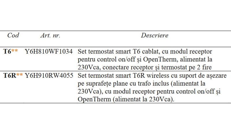 Termostatele ”inteligente” din seria T6 si T6R sunt destinate sa asigure controlul temperaturii functie de timp in instalatiile de incalzire din vile si apartamente. Seria este disponibila in doua variante: cablat si wireless, ambele fiind dotate cu ecran tactil si cu acces via app. T6 cablat: termostatul se monteaza pe perete si se cableaza cu 2 fire la modulul receptor de la care se si alimenteaza cu 230V, la modulul receptor se conecteaza echipamentul controlat on/off sau OpenTherm. Pentru controlul aparatelor on/off alimentate la 24...230V si OpenTherm cum ar fi: cazane murale, pompe de caldura, reglaj de zona cu ventile motorizate sau pompe. Nu este recomandat pentru incalzire electrica.