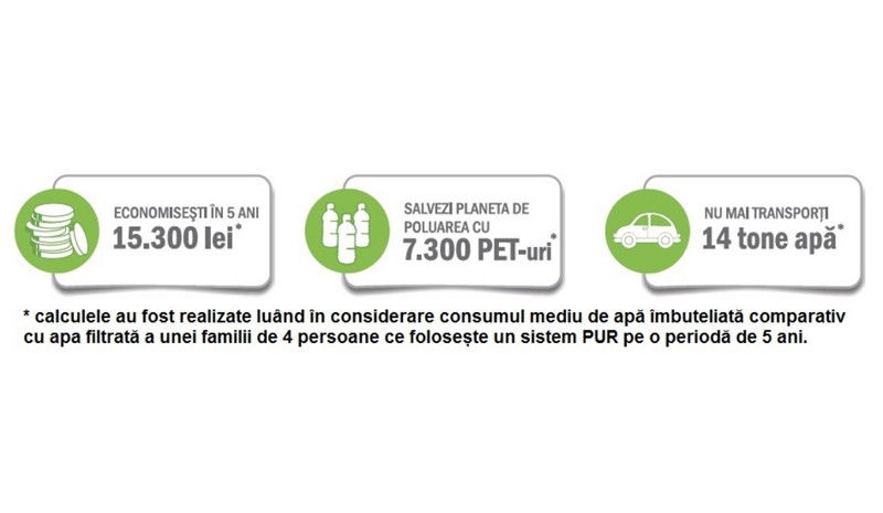Costul unui sistem PUR + consumabile + apa de la reteaua publica pe o perioada de 5 ani = 2.200 lei/an. Economie de 15.300 lei in 5 ani.