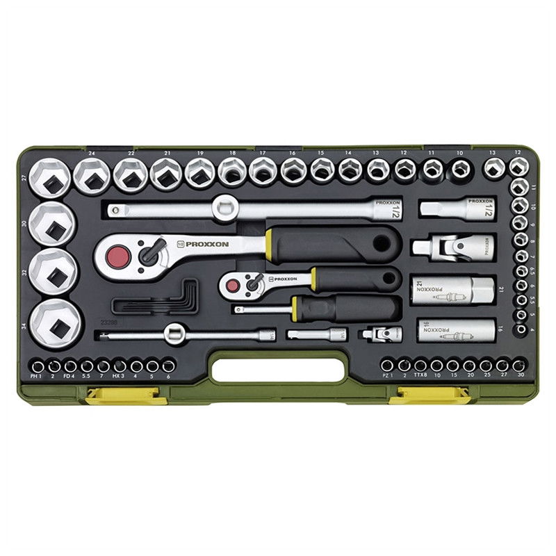 Acest set de 65 piese include cheile tubulare dela 4 la 34mm precum si cheile pentru bujii de 16 si 21mm. Capetele de surubelnita, cu patrat de prindere de 1/4” si profilul varfului drept, Phillips, TX (cu gaura) si HEX. Setul mai include chei HEX L marimile 1.25 – 1.5 – 2.0 – 2.5 si 3.0mm. Patru prelungitoare, un maner de surubelnita cu patrat de prindere si doua adaptoare cardanice mai sunt incluse in pachet. Acest set contine si cheia tubulara de 34mm, conform noului standard ISO (pentru suruburile M22).