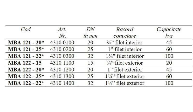 Seria MBA de robinete cu bila motorizate este destinata a fi utilizata la izolarea circuitelor,pompe de caldura, control de zona, alimentare si golire rezervoare sau decantoare. Robinetele MBA pot fi folosite atat pentru circuite inchise cat si pentru circuite deschise. Datorita formei constructive - cu bila - inchiderea se realizeza etans iar caderea de presiune pe ventil este foarte mica. Servomotorul este dotat standard cu rezistor anti-condens si contact auxiliar.