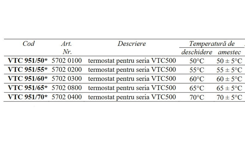 Termostate cu diferite valori ale temperaturii de deschidere, compatibile cu toate modelele de LTC161, LTC171, LTC261, LTC271, LTC361, LTC381, VTC511, VTC512 și VTC531.